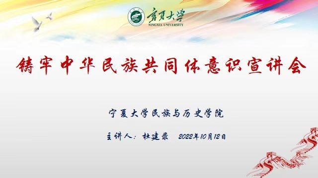 召开铸牢中华民族共同体意识线上宣讲报告会,由学院院长杜建录主讲,学院党委副书记刘翔未主持,学院全体师生参加。