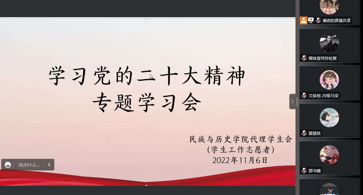 专题学习会由2020级历史系学生雍政领学,会议首先学习了习近平总书记:高举中国特色社会主义伟大旗帜,为全面建设社会主义现代化国家而团结奋斗——在中国共产党第二十次全国代表大会上所作的报告。明确了中国共产党第二十次全国代表大会,是在全党全国各族人民迈上全面建设社会主义现代化国家新征程、向第二个百年奋斗目标进军的关键时刻召开的一次重要的大会。学习总结了过去五年的工作和新时代十年的伟大变革,开辟马克思主义中国化时代化新境界,新时代新征程中国共产党的使命任务等十五个方面的内容。