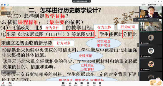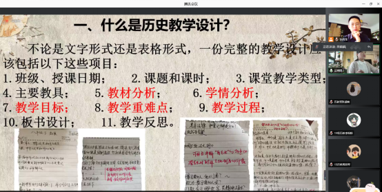 随后,那如何进行历史教学设计,吴老师根据自己的备课流程,为同学们进行了详细的讲解,教学设计要做到环环紧扣,体现整个过程的层次性和完整性。注重分析教材和学情,老师强调要关注教材的版本和变化,使用最新的教材,分析教材的内容和知识结构,并且要站在整体的角度分析每一课;另外,要考虑学生的接受水平,确保不同层次的学生在课堂上都要有所收获,对于教学一定要做到有的放矢。更重要的是,老师强调对教学目标的制定,今年是尤为特殊的一年,新课标的实施,由三维目标向核心素养的转变,这就要求同学们在新课标的背景之下,完善教学过程的每一个步骤。明确重难点,学会预判难点,突破重点。老师强调在教学中处于重头戏的则是教学过程,这也是体现教师水平的一个环节,教学过程的变化性、创造性和灵活性很强,每一个环节都需要经过精心的设计和打磨,并且要其注重完整性和趣味性。