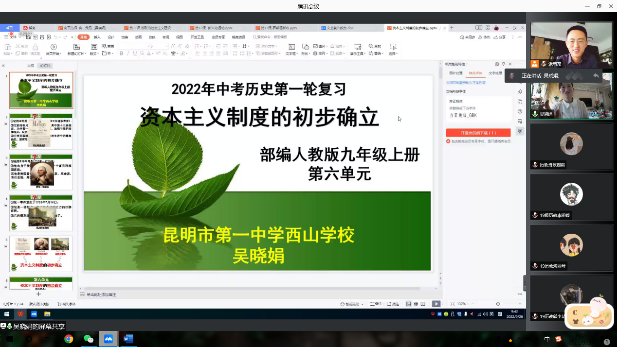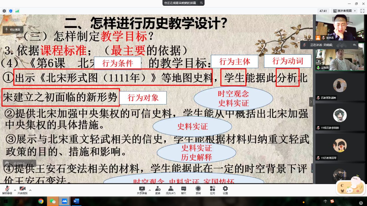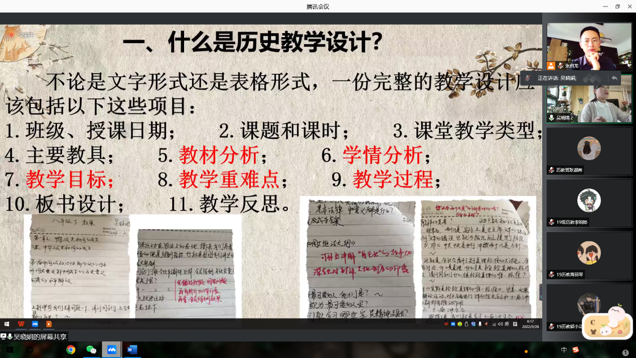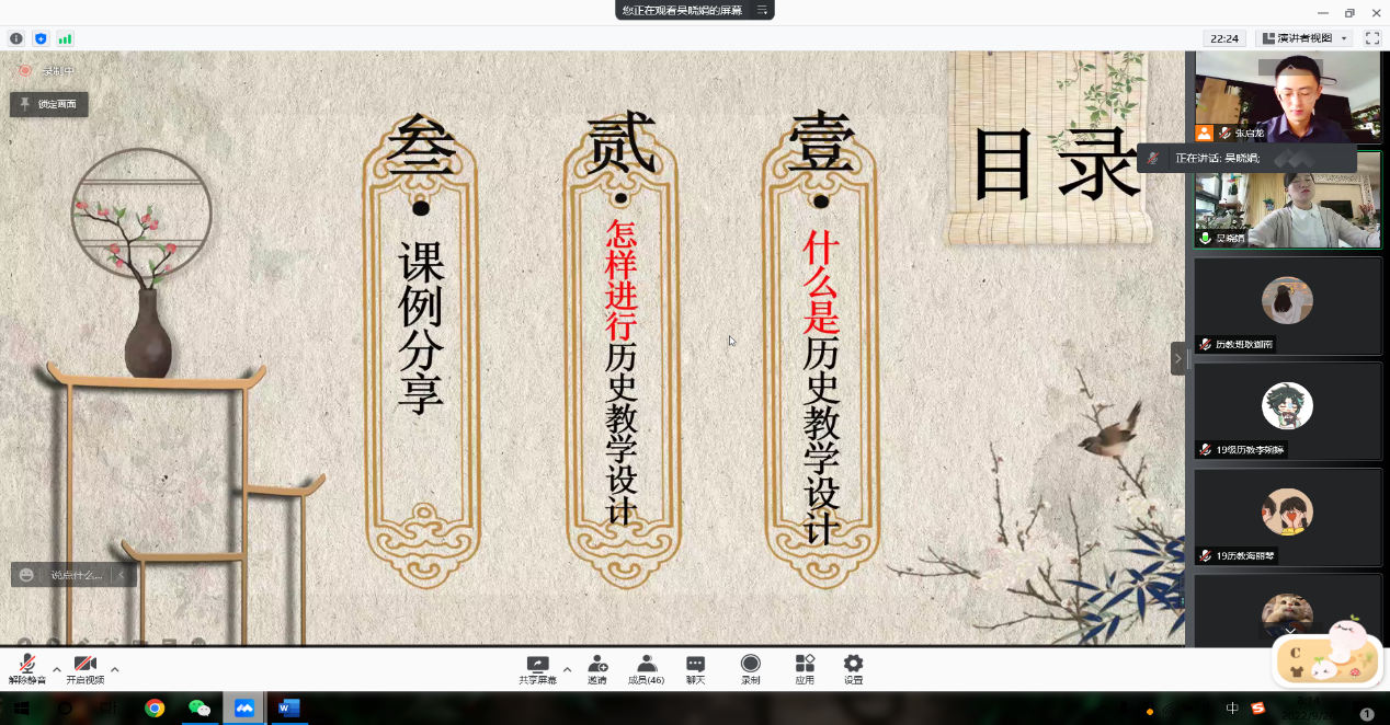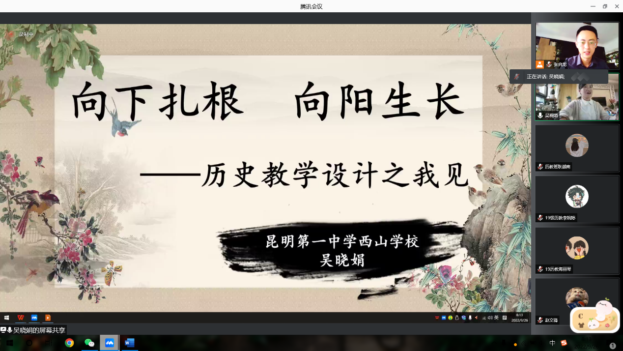 于2022年9月26日上午进行了“历史名师面对面”系列讲座第五讲。部分历史学(师范)本科生和学科教学(历史)全体研究生,参与了线上腾讯讲座。本次讲座邀请了云南昆明第一中学西山学校教学名师吴晓娟主讲,主题为“向下扎根,向阳生长——历史教学设计之我见”,活动由历史系副主任张启龙老师主持。
